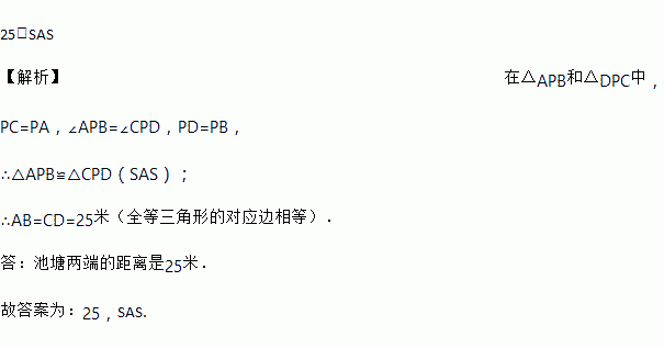 如图,要测量池塘的宽度AB,在池塘外选取一点P,连接AP、BP并各自延长,使PC=PA,PD=PB,连接CD,测得CD长为25m,则池塘宽AB为________ m,依据是________