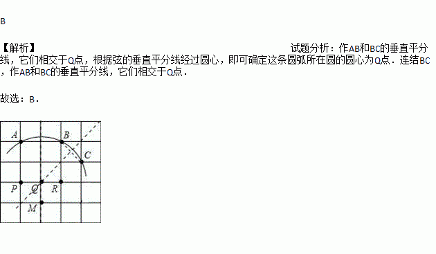 如图,在5×5正方形网格中,一条圆弧经过A,B,C三点,那么这条圆弧所在圆的圆心是( )