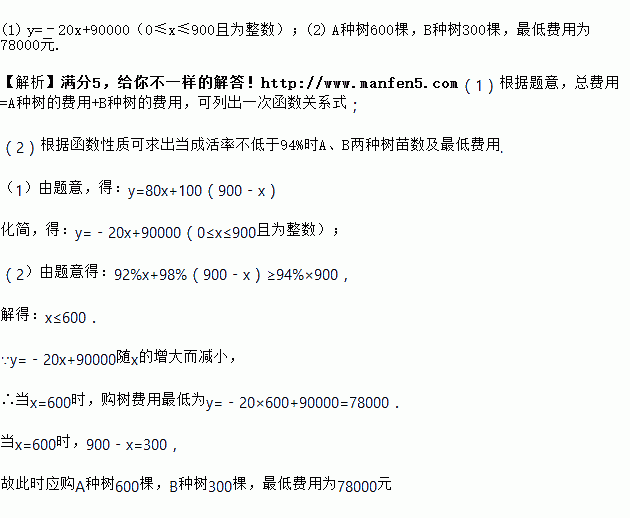 (2)若希望这批树的成活率不低于94%,且使购树的总费用最低,应选购A、B两种树各多少棵?此时最低费用为多少?