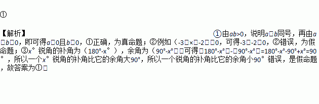 有下列命题:①若a+b>0且ab>0,则a>0且b>0;②若a>b且ab>0,则a>b>0;③一个锐角的补角比它的余角小90°.其中属于真命题的是______(填序号).