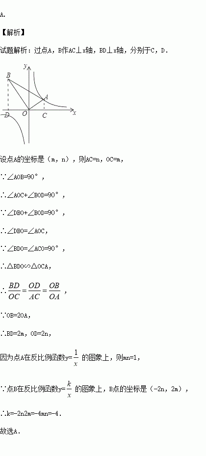 如图,△AOB是直角三角形,∠AOB=90°,OB=2OA,点A在反比例函数y=的图象上.若点B在反比例函数y=的图象上,则k的值为( )