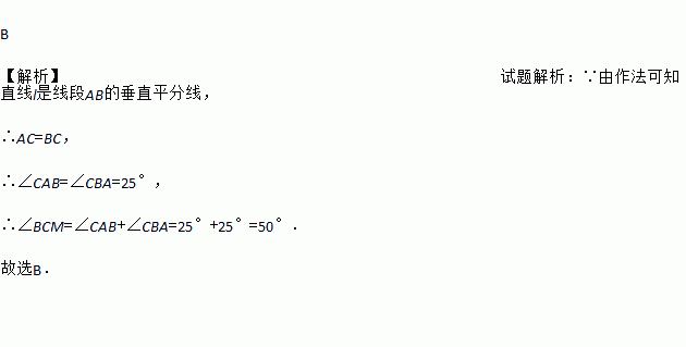 AB为半径作弧,连接弧的交点得到直线l,在直线l上取一点C,使得∠CAB=25°,延长AC至M,求∠BCM的度数为( )