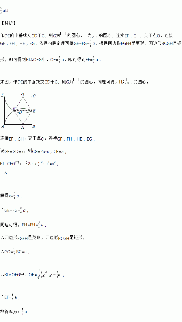 如图,正方形ABCD的边长为2a,E为BC边的中点, 的圆心分别在边AB、CD上,这两段圆弧在正方形内交于点F,则E、F间的距离为 .