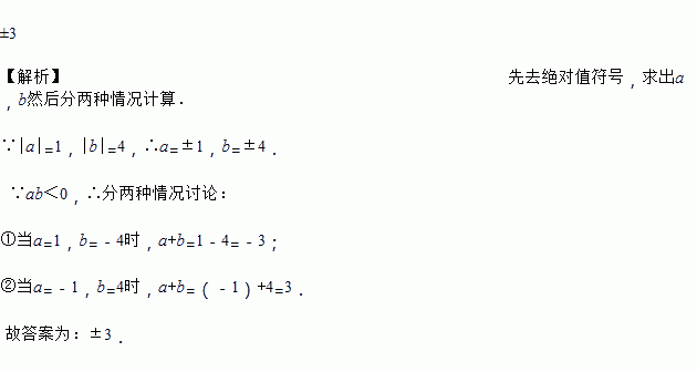 |a|=1,|b|=4,且ab<0,则a+b=________.