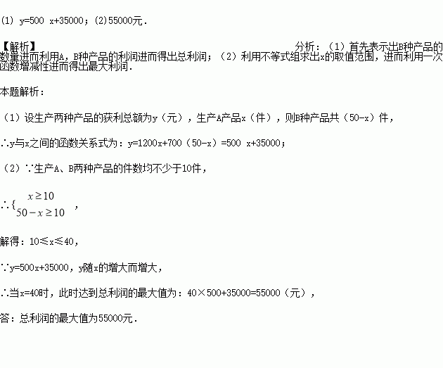 某厂计划生产A、B两种产品共50件.已知A产品每件可获利润1200元,B产品每件可获利润700元,设生产两种产品的获利总额为y (元),生产A产品x (件).