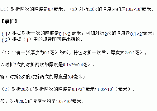 有一张厚度为0.1毫米的纸片,对折一次后的厚度是2×0.1毫米.