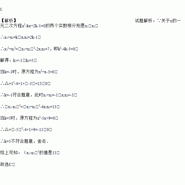 关于x的一元二次方程x2﹣kx+2k﹣1=0的两个实数根分别是x1、x2,且x12+x22=7,则(x1﹣x2)2的值是( )