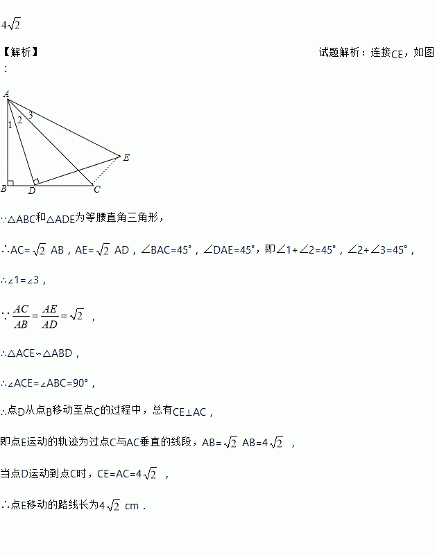 如图,等腰直角三角形中, =4 cm.点是边上的动点,以为直角边作等腰直角三角形.在点从点移动至点的过程中,点移动的路线长为_________cm.