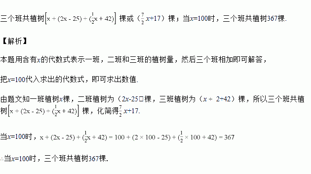 初一年级三个班参加植树,一班植树x棵,二班植的树比一班植树的2倍少25棵,三班植的树比一班植树的一半多42棵,三个班共植树多少棵?当x=100时,三个班共植树多少棵?