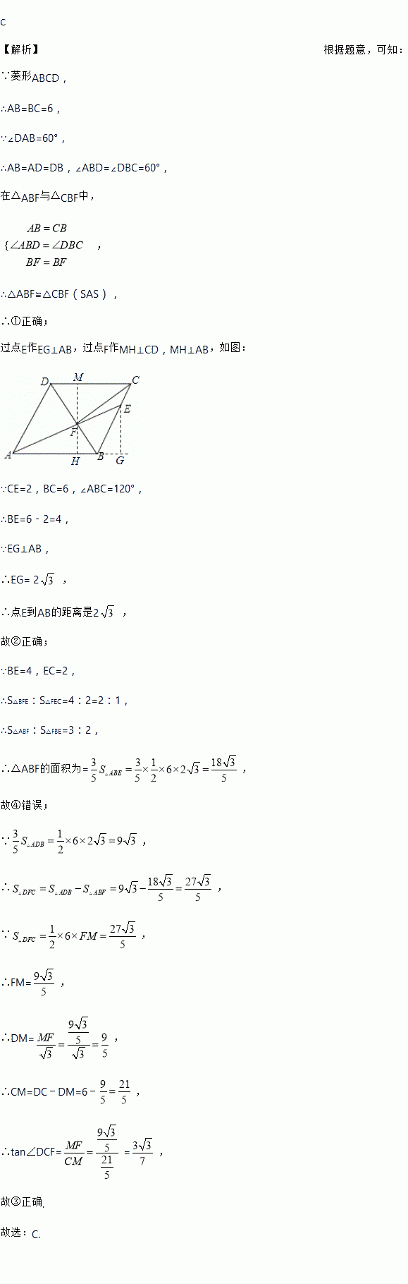 如图,在菱形ABCD中,AB=6,∠DAB=60°,AE分别交BC、BD于点E、F,CE=2,连接CF,以下结论:①