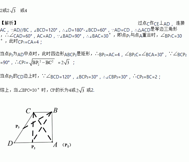 已知:如图,在四边形中ABCD中,AB⊥BC,AD∥BC,∠BCD=120°,BC=2,AD=DC.P为四边形ABCD边上的任意一点,当∠BPC=30°时,CP的长为______.