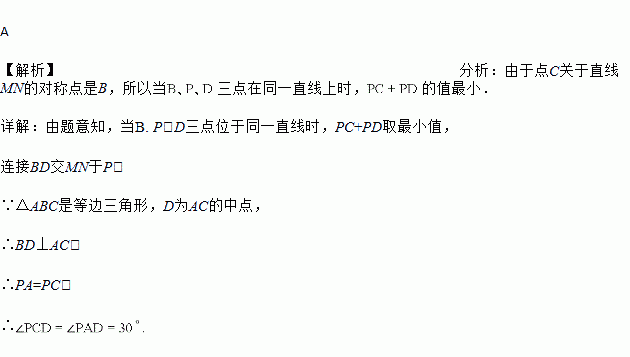 如图,MN是等边三角形ABC的一条对称轴,D为AC的中点,点P是直线MN上的一个动点,当PC+PD最小时,∠PCD的度数是( )