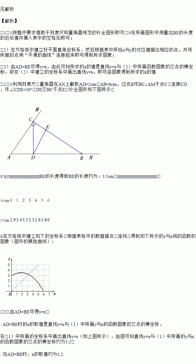 (1)取指定点作图.根据下面表格预填结果,先通过作图确定AD=2cm时,点E的位置,测量BE的长度。