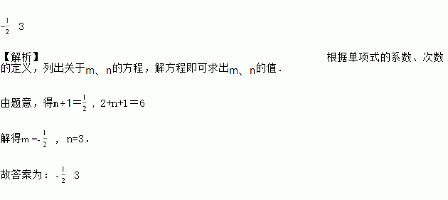 若(m+1)x2yn+1是关于x,y的六次单项式,且它的系数是,则m=,n=________.