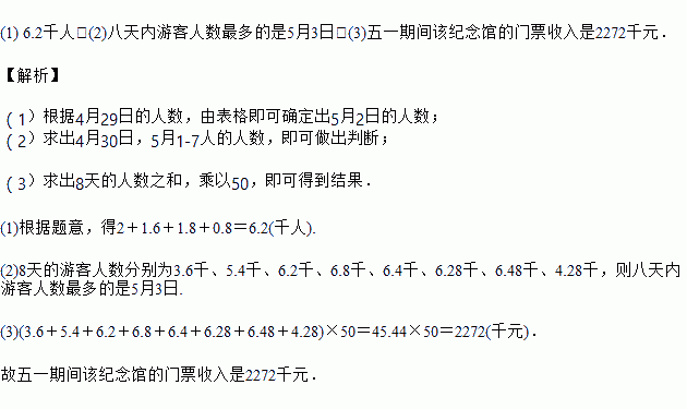 (3)若五一期间的门票价格为每人50元,则五一期间该纪念馆的门票收入是多少?
