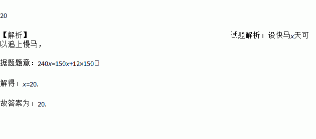 20 【解析】试题解析:设快马x天可以追上慢马, 据题题意:240x=150x+12×150, 解得:x=20. 故答案为:20.