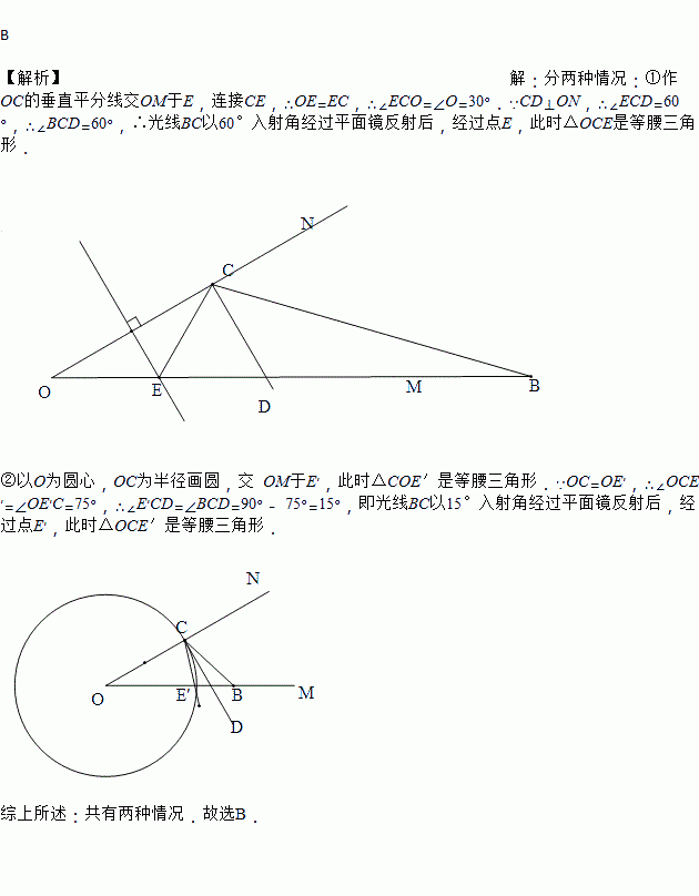 过平面镜反射后,反射光线与边OM的交点记为E,则△OCE是等腰三角形的个数有( )