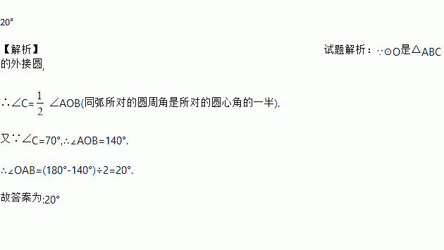 如图,已知☉O是△ABC的外接圆,且∠C =70°,则∠OAB =________.