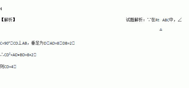 如图,在Rt△ABC中,∠C=90°,CD⊥AB,垂足为D,AD=8,DB=2,则CD的长为__.
