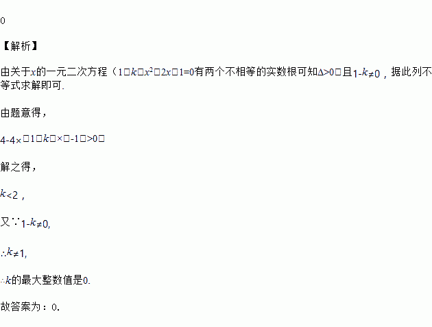 已知关于x的一元二次方程(1﹣k)x2﹣2x﹣1=0有两个不相等的实数根,则k的最大整数值是_____.