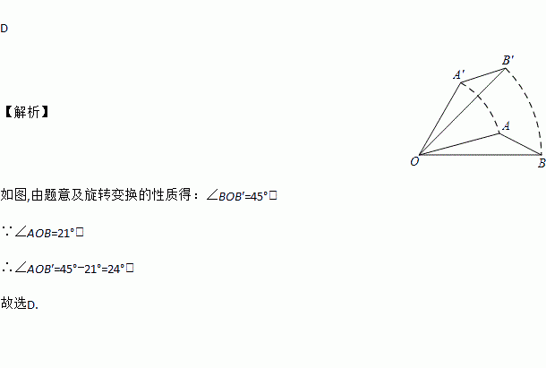 D 【解析】 如图,由题意及旋转变换的性质得:∠BOB′=45°, ∵∠AOB=21°, ∴∠AOB′=45°?21°=24°, 故选D.