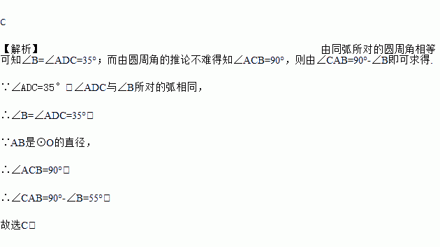 如图,AB为⊙O的直径,CD是⊙O的弦,∠ADC=35°,则∠CAB的度数为( )