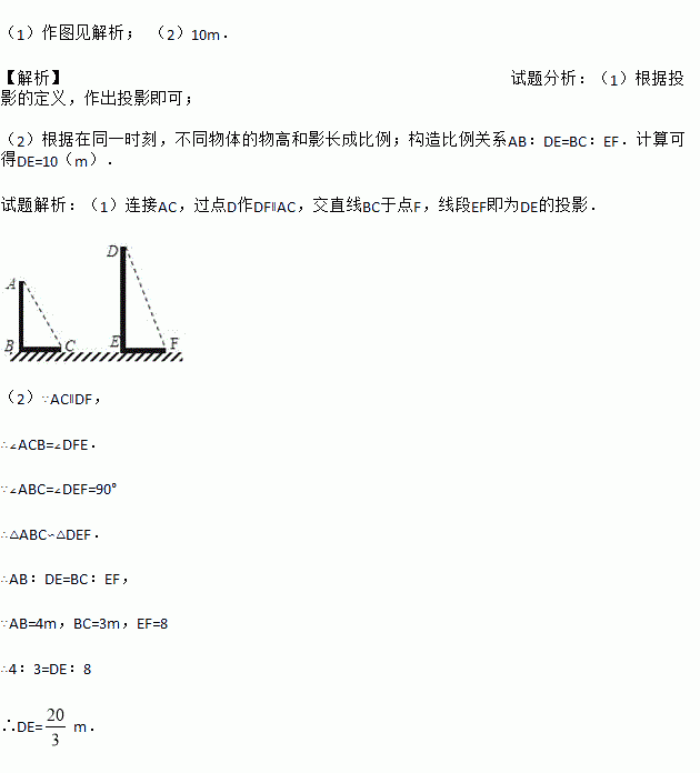 (2)在测量AB的投影时,同时测量出DE在阳光下的投影长为6m,请你计算DE的长.