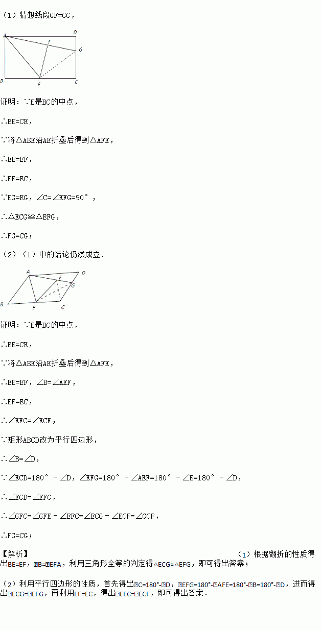如图,在矩形ABCD中,E是BC的中点,将△ABE沿AE折叠后得到△AFE,点F在矩形ABCD内部,延长AF交CD于点G.猜想线段GF与GC有何数量关系?并证明你的结论.