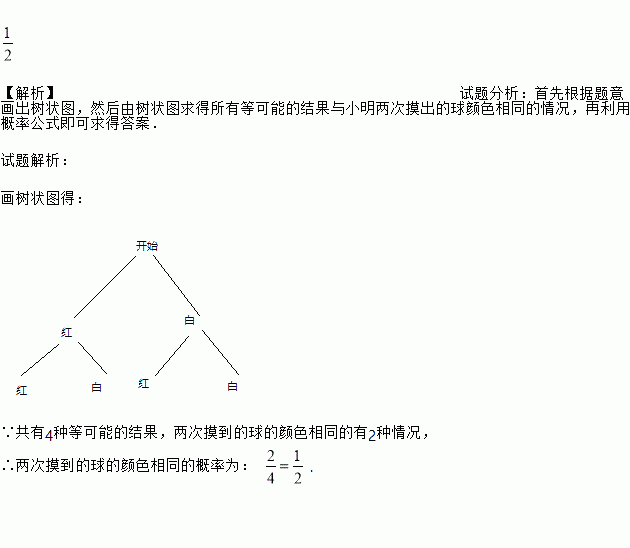 【解析】试题分析:首先根据题意画出树状图,然后由树状图求得所有等可能的结果与小明两次摸出的球颜色相同的情况,再利用概率公式即可求得答案. 试题解析: 画树状图得: ∵共有4种等可能的结果,两次摸到的球的颜色相同的有2种情况, ∴两次摸到的球的颜色相同的概率为: .