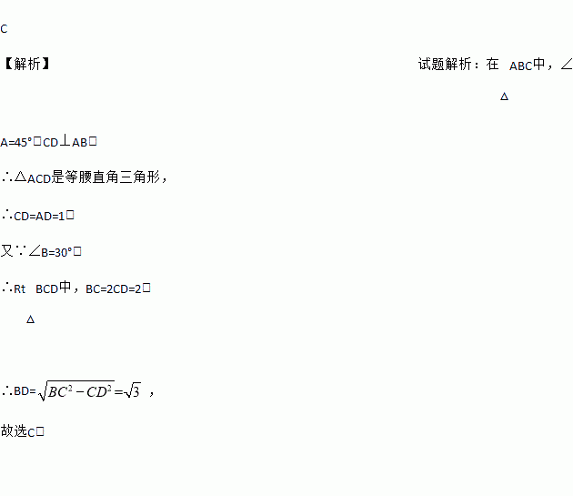 如图,在△ABC中,∠A=45°,∠B=30°,CD⊥AB,垂足为D,AD=1,则BD的长为( )