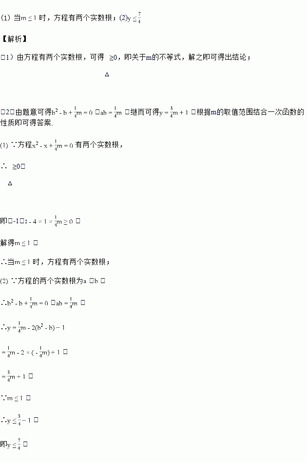 (2)设此方程的两个实数根为a、b,若y=ab-2b2+2b+1,求y的取值范围.