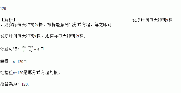 为了改善生态环境,防止水土流失,红旗村计划在荒坡上种树960棵,由于青年志愿者支援,实际每天种树的棵数是原计划的2倍,结果提前4天完成任务,则原计划每天种树的棵数是________.