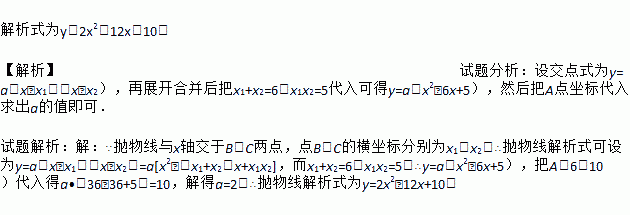 如果一个二次函数的图象经过点A(6,10),与x轴交于B,C两点,点B,C的横坐标分别为x1,x2,且x1+x2=6,x1x2=5,求这个二次函数的解析式.