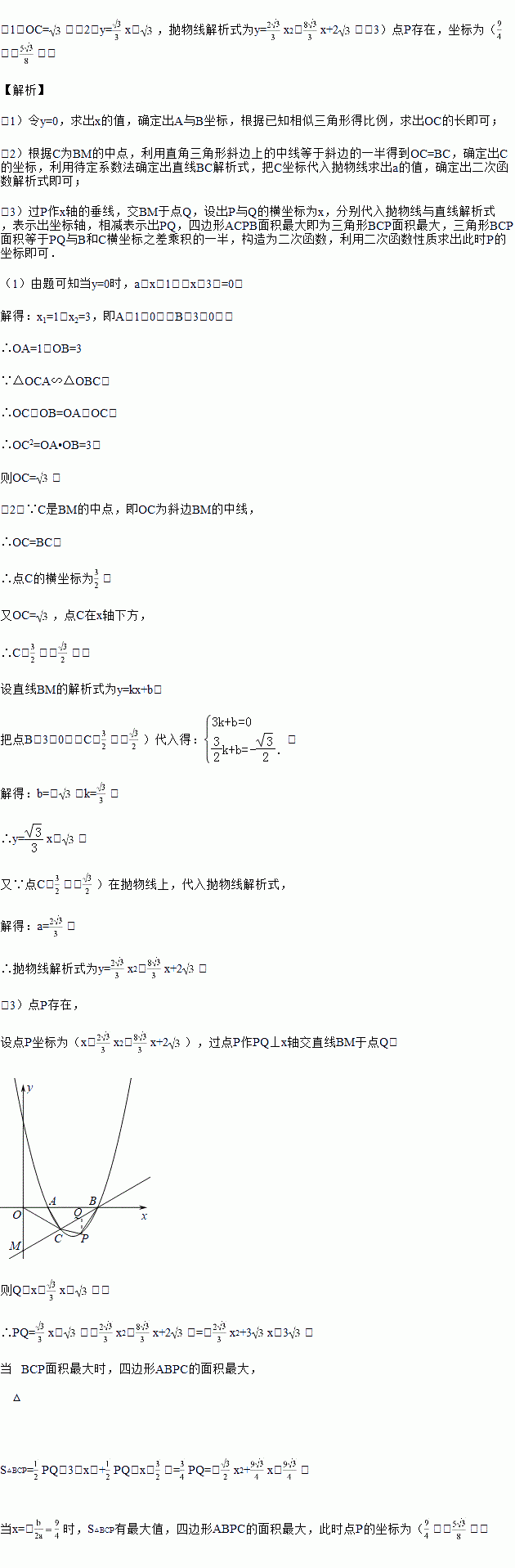 如图,抛物线y=a(x﹣1)(x﹣3)(a>0)与x轴交于A、B两点,抛物线上另有一点C在x轴下方,且使△OCA∽△OBC.