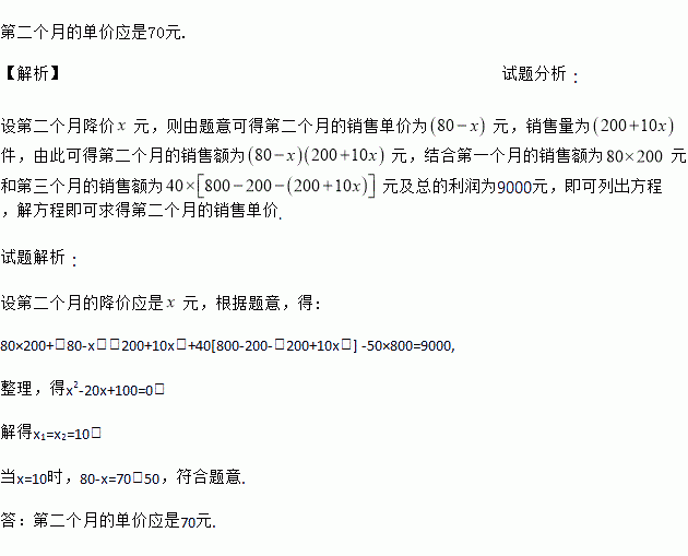 第二个月的单价应是70元. 【解析】试题分析: 设第二个月降价元,则由题意可得第二个月的销售单价为元,销售量为件,由此可得第二个月的销售额为元,结合第一个月的销售额为元和第三个月的销售额为元及总的利润为9000元,即可列出方程,解方程即可求得第二个月的销售单价. 试题解析: 设第二个月的降价应是元,根据题意,得: 80×200+(80-x)(200+10x)+40[8...