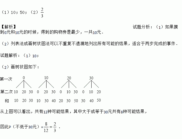 (2)请你用画树状图或列表的方法,求出该顾客所获得购物券的金额不低于30元的概率.