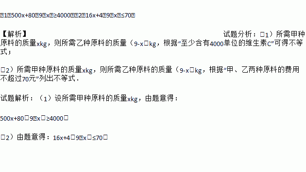 (1)500x+80(9﹣x)≥4000;(2)16x+4(9﹣x)≤70. 【解析】试题分析:(1)所需甲种原料的质量xkg,则所需乙种原料的质量(9-x)kg,根据“至少含有4000单位的维生素C”可得不等式; (2)所需甲种原料的质量xkg,则所需乙种原料的质量(9-x)kg,根据“甲、乙两种原料的费用不超过70元”列出不等式. 试题解析:(1)设所需甲种原料的质量xkg,...
