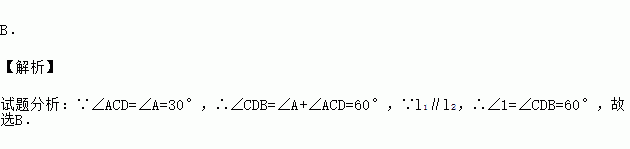 含30°角的直角三角板与直线l1、l2的位置关系如图所示,已知l1∥l2,∠ACD=∠A,则∠1=( )