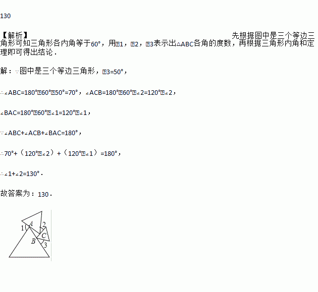 三个等边三角形的位置如图所示,若∠3=50°,则∠1+∠2= °.