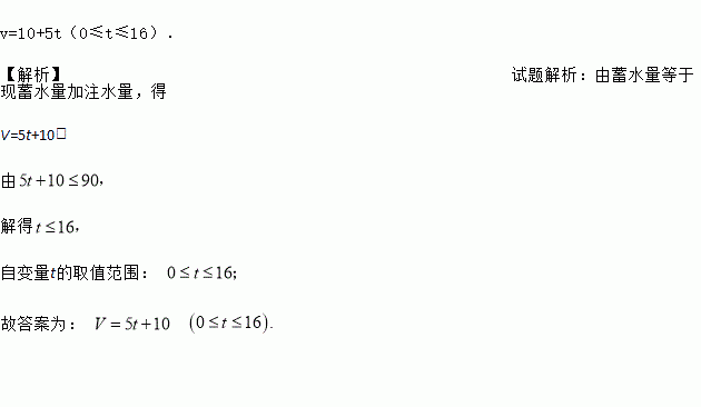 v=10+5t(0≤t≤16). 【解析】试题解析:由蓄水量等于现蓄水量加注水量,得 V=5t+10, 由 解得 自变量t的取值范围: 故答案为: