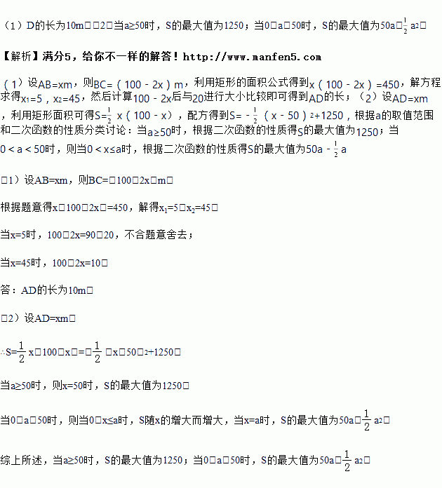 (1)若a=20,所围成的矩形菜园的面积为450平方米,求所利用旧墙AD的长;