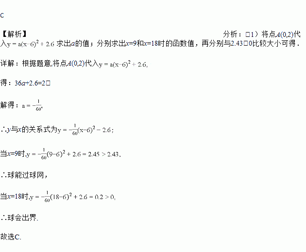如图,排球运动员站在点O处练习发球,将球从O点正上方2m的A处发出,把球看成点,其运行的高度y(m)与运行的水平距离x(m)满足关系式y=a(xk)2+h.已知球与O点的水平距离为6m时,达到最高2.6m,球网与O点的水平距离为9m.高度为2.43m,球场的边界距O点的水平距离为18m,则下列判断正确的是( )![]()