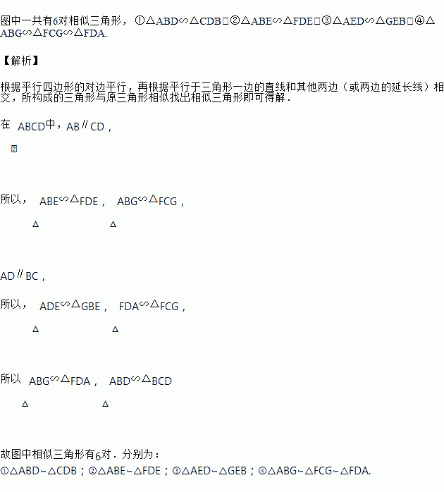 如图,在ABCD中,点G是BC延长线上一点,AG与BD交于点E,与DC交于点F,则图中相似三角形共有几对?分别写出来.