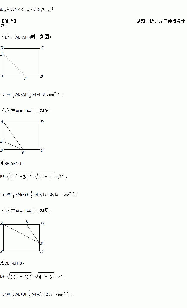 如图,在一张长为7cm,宽为5cm的矩形纸片上,现要剪下一个腰长为4cm的等腰三角形(要求:等腰三角形的一个顶点与矩形的一个顶点重合,其余的两个顶点在矩形的边上),则剪下的等腰三角形的面积为 .