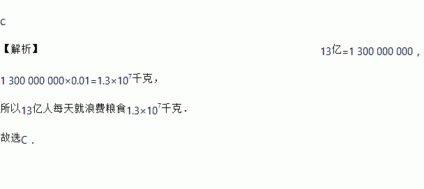 温家宝总理有一句名言:“多么小的问题,乘以13亿,都会变得很大,多么大的经济总量,除以13亿,都会变得很小”如果每人每天浪费0.01千克粮食,我国13亿人每天就浪费粮食( )
