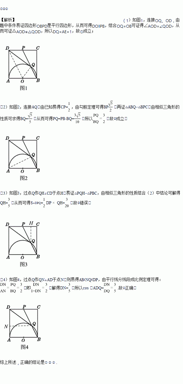 如图,正方形ABCD边长为1,以AB为直径作半圆,点P是CD中点,BP与半圆交于点Q,连接DQ.给出如下结论: