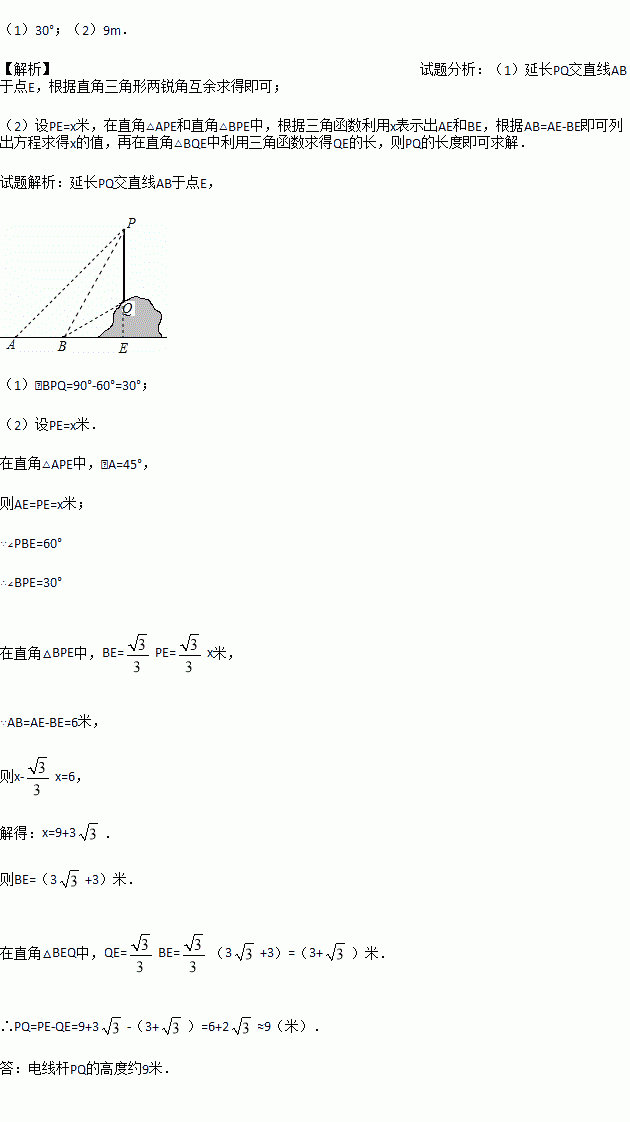 如图,从地面上的点A看一山坡上的电线杆PQ,测得杆顶端点P的仰角是45°,向前走6m到达B点,测得杆顶端点P和杆底端点Q的仰角分别是60°和30°.