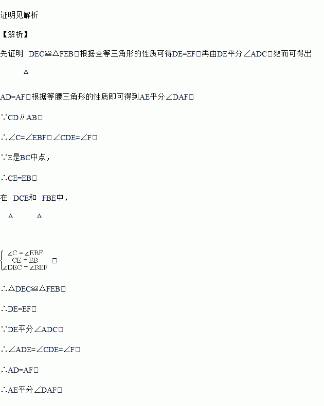 如图,AB∥CD,E是BC的中点,DE平分∠ADC,DE的延长线交AB于点F,求证:AE平分∠DAF