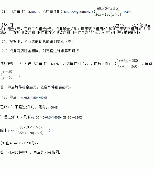 (1)甲店每件租金50元,乙店每件租金60元(2)y1=40x,y2=(3)30 【解析】试题分析:(1)设甲店每件租金x元,乙店每件租金y元,根据等量关系:甲服装店租用2件和在乙服装店租用3件共需280元,在甲服装店租用4件和在乙服装店租用一件共需260元,列方程组进行求解即可; (2)根据甲、乙两店的优惠政策列式即可得; (3)根据两店租金相同,列方程进行求解即可得. ...