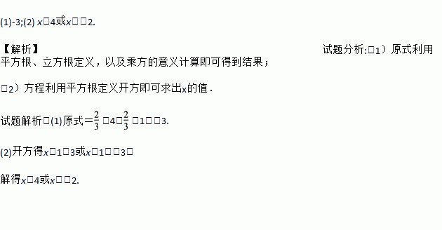 (1)-3;(2) x=4或x=-2. 【解析】试题分析:(1)原式利用平方根、立方根定义,以及乘方的意义计算即可得到结果; (2)方程利用平方根定义开方即可求出x的值. 试题解析:(1)原式=-4-+1=-3. (2)开方得x-1=3或x-1=-3, 解得x=4或x=-2.